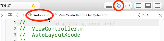 除此之外,Xcode的Preview工具还可以允许我们同时预览不同屏幕大小的界面情况,方便我们进行对比。打开Assistant Editor,点击快速跳转下拉菜单: