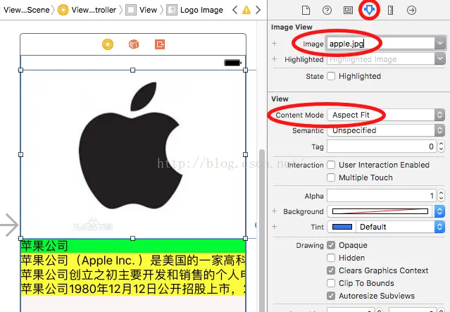 选中Logo Image,在属性窗口(Attributes Inspector)的Image View中,将Image设置为apple.jpg,将Content Mode设置为Aspect Fit,这样就能根据Image View的大小来调整图片的缩放方式。