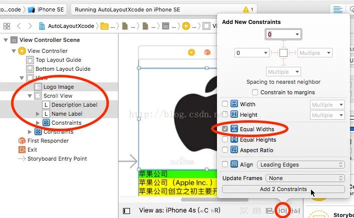 请注意,当使用自动布局为Scroll View添加约束时,除了需要确定ScrollView本身的位置尺寸之外,还需要明确ScrollView的ContentSize大小。对于上述例子,Scroll View本身会占用下半部分屏幕,但是其ContentSize的大小是不确定的,所以会出现异常滚动效果。因此我们还需要为两个Label确定宽高,这样才能计算出ContentSize。按住Command键,在文档结构窗口中选中Logo Image、Name Label与Description Label,点击Pin按钮,在弹出的窗口中选中Equal Width,这样就使得两个Label的宽度总与Image View的宽度相等,即Scroll View的ContentSize的宽度总是和Scroll View本身的宽度相同,因此就不会出现横向滚动的情况了。