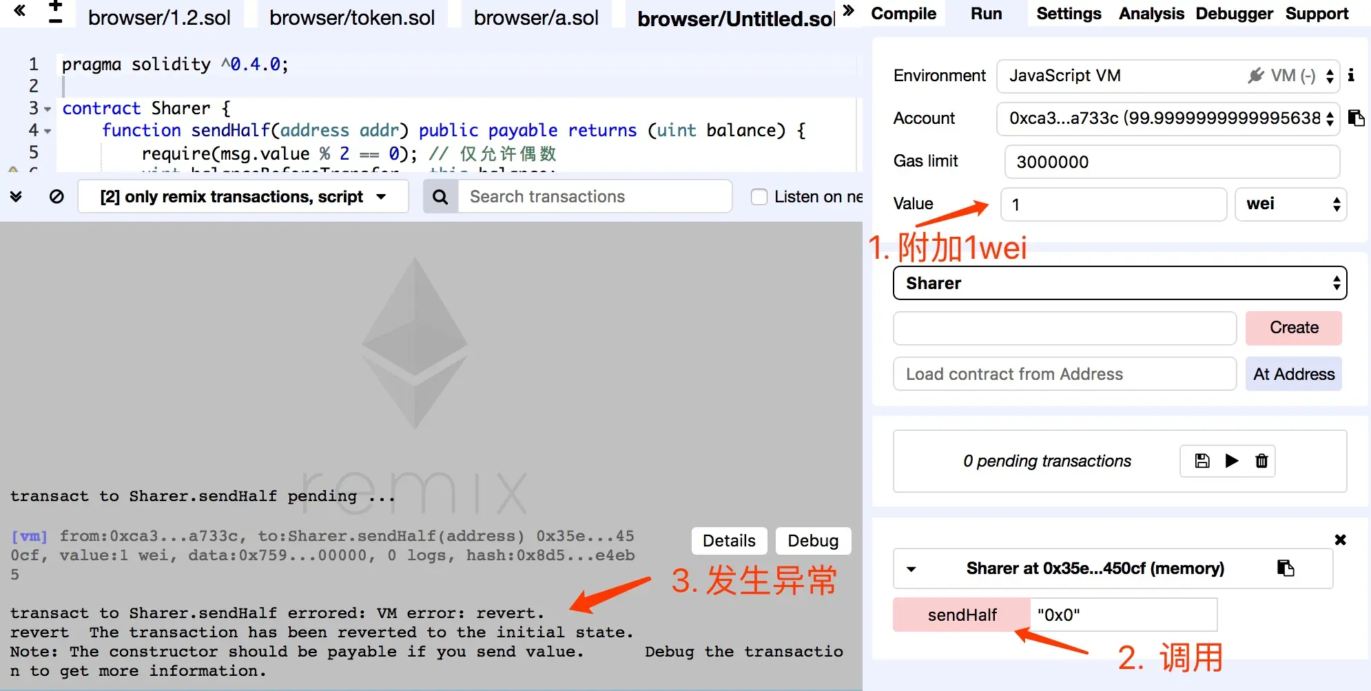 - 运行测试3:附加2wei以及sendHalf参数为当前合约本身,在转账是发生异常,因为合约无法接收转账,错误提示上图类似。
