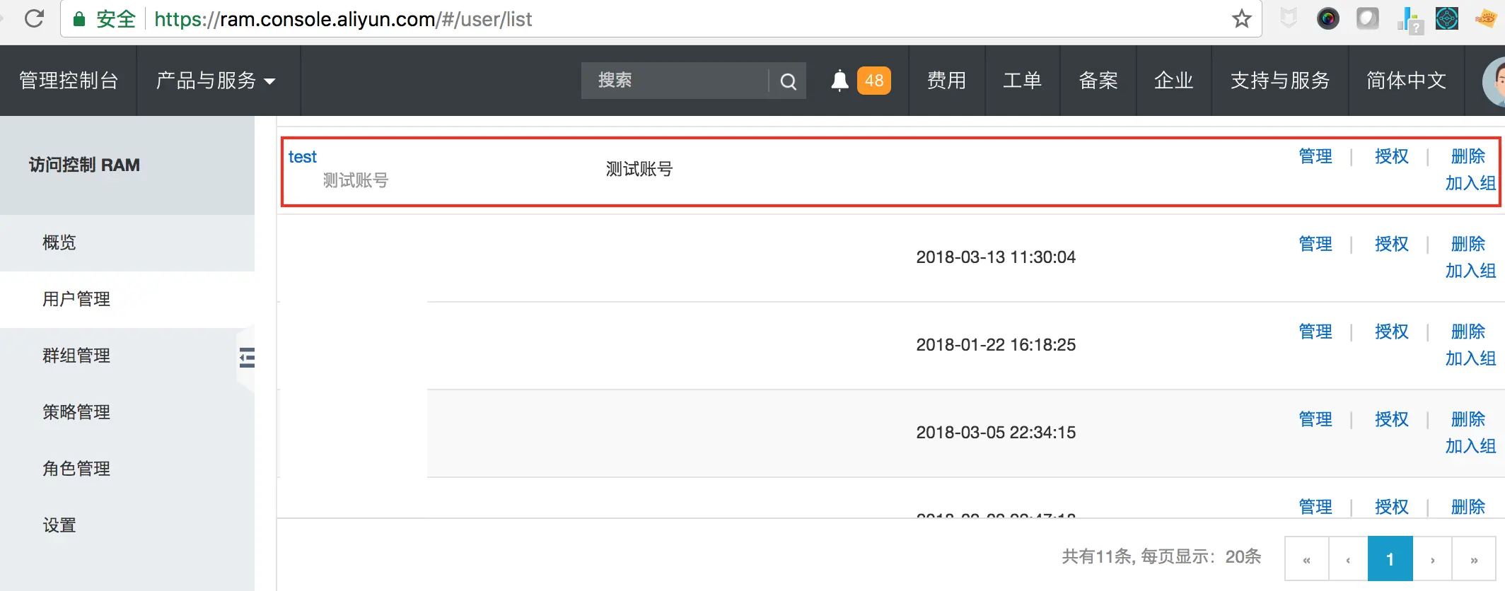 登陆 访问控制 页面,点击“用户管理”,选择“新建用户”,创建子账号 test ,创建成功如下图所示: