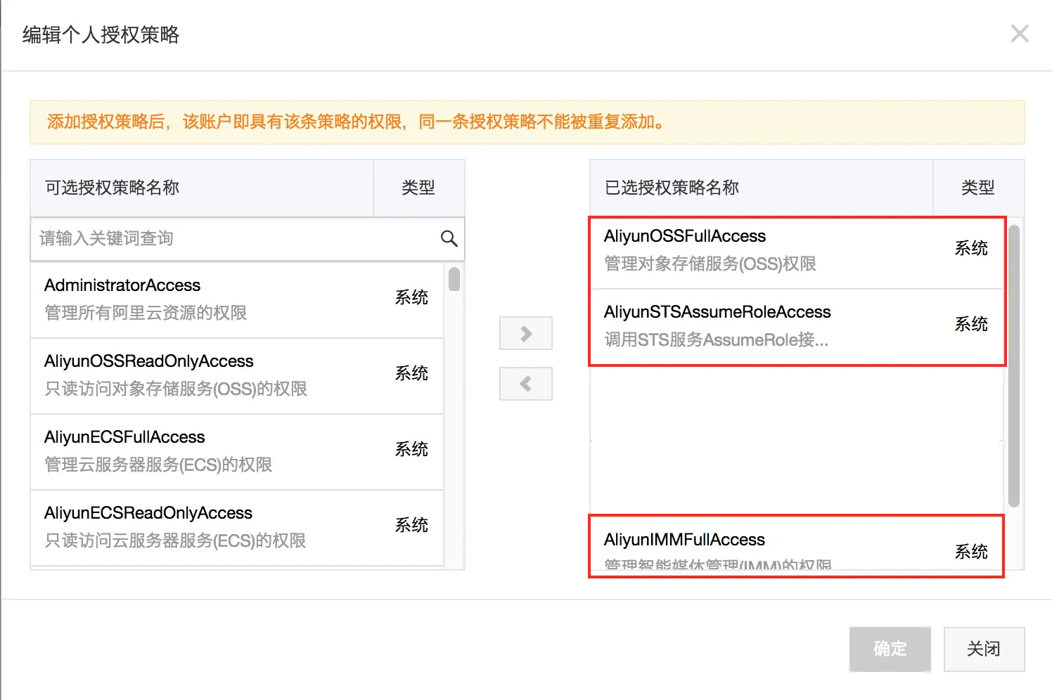 - AliyunIMMFullAccess。具有执行 IMM 服务的权限,具有了该权限就可以调用文档转换接口。