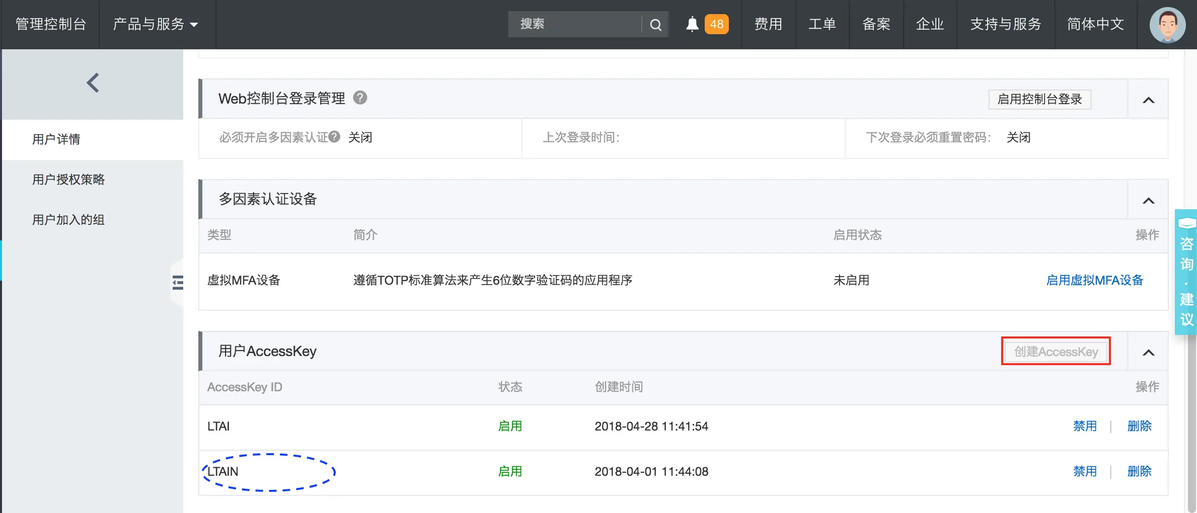 注意:目前每个子账号最多使用2个 AK,可以通过删除旧的 AK 来解决。