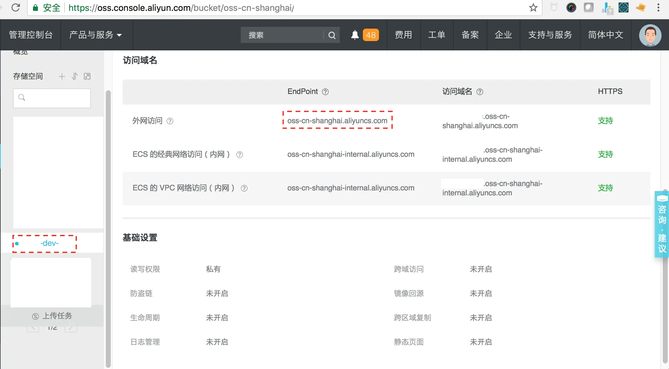 在 华东2(上海区域)创建了 yourid-dev-imm 桶。