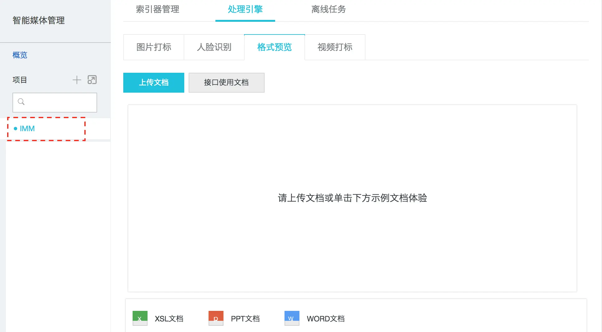 转换/预览使用 IMM 服务,先 开通产品 产品,然后 创建项目,如下图所示,在 华东2(上海区域)创建了 imm 项目。