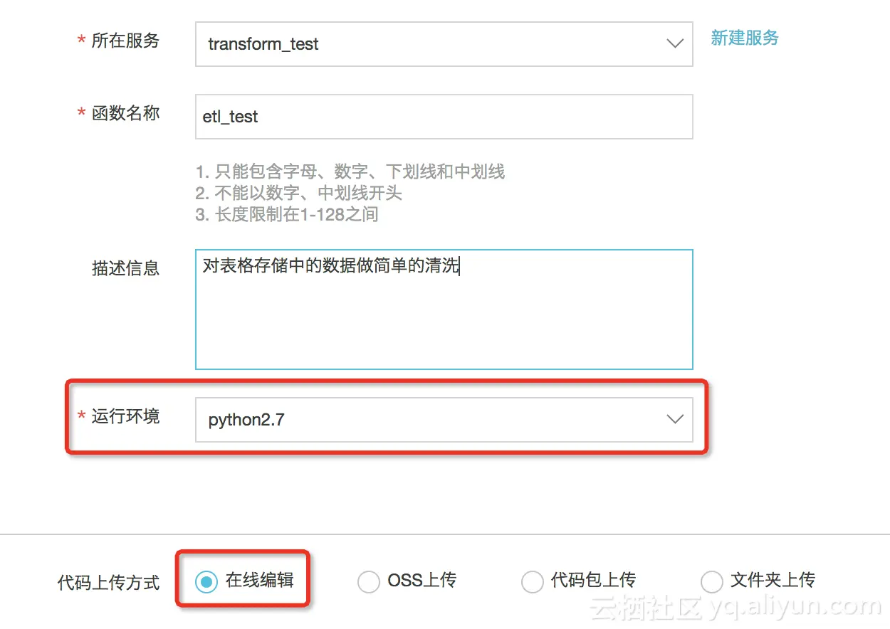 - 函数名称为:etl_test,选择 python2.7 环境,在线编辑代码