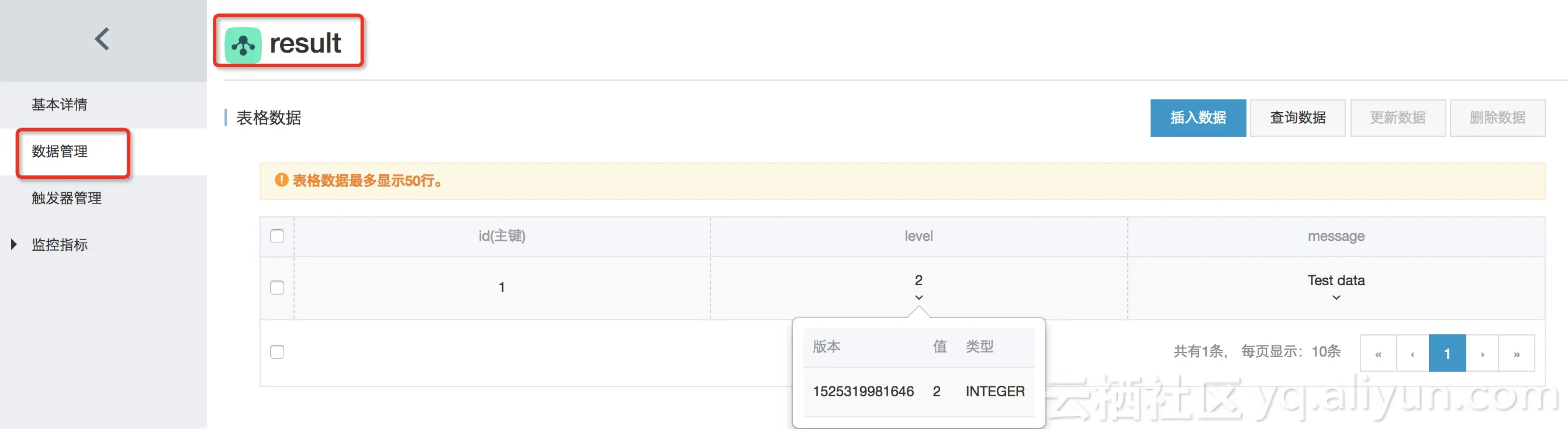 点击 result 表的数据管理页面,会查询到刚写入到 source_data 中的数据。