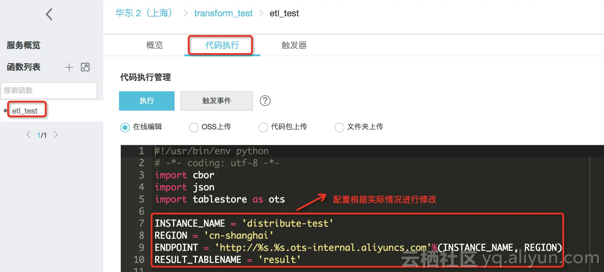 创建好函数之后,点击对应的函数—代码执行,编辑代码并保存,其中,INSTANCE_NAME(表格存储的实例名称)、REGION(使用的区域)需要根据情况进行修改:
