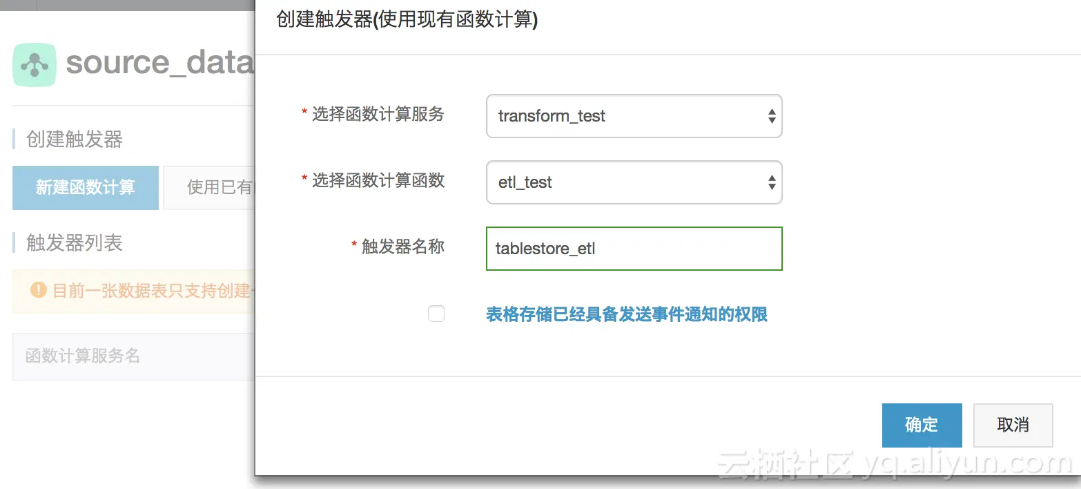 1.回到表格存储的实例管理页面,点击表 source_data 后的 使用触发器 按钮,进入触发器绑定界面,点击使用已有函数计算, 选择刚创建的服务及函数,勾选 表格存储发送事件通知的权限, 进行确定。