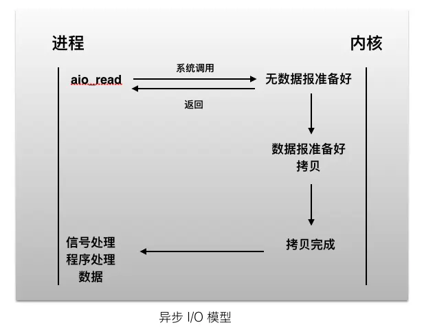 进程告知内核启动某个操作,随即返回,由内核进行整个操作,操作完成后通知进程! (POSIX 异步 I/O 函数以 aio_ 或 lio_ 开头),不阻塞!