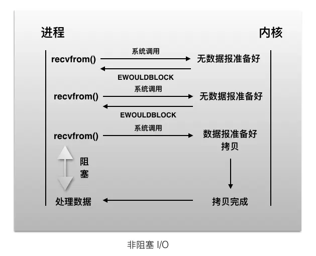 若一个进程调用 recvfrom( ) 来读取数据,进程从调用 recvfrom (系统调用)开始到它返回的整段时间内是阻塞的,只有成功返回后进程才能开始处理数据。