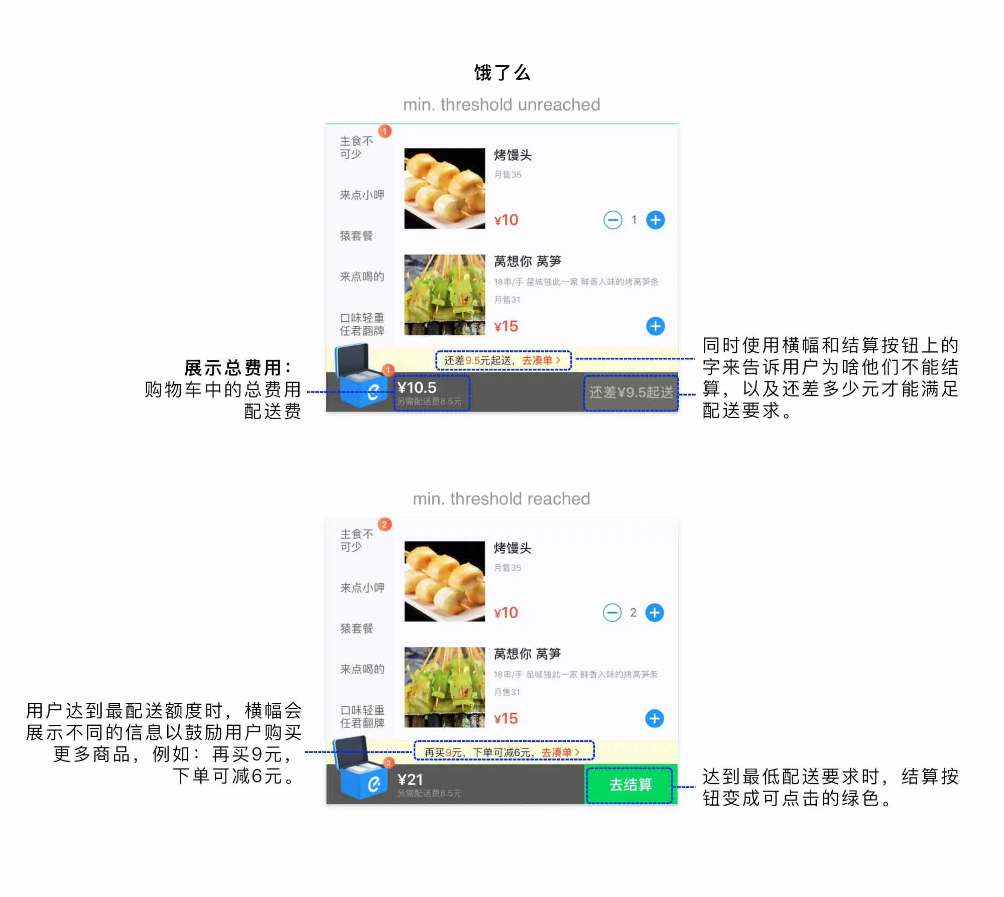 在我之前的文章中,谈论了在Instacart app的购物体验,其中一个关键点是,用户不知道最低消费额是多少,并且当用户满足了最低消费额的时候,应用没有提供任何关于此的提示,但美团和饿了么都巧妙的解决了这个问题。