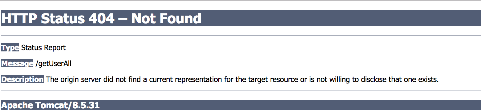 今天Tomcat部署完项目,然后访问url,结果报404错误花了好几天时间,原来是我的url访问后面没有带项目名称, 也就是http://localhost:8080/${project_name}/getUserAll 而我的是http://localhost:8080/getUserAll,所以报错,以下报错信息