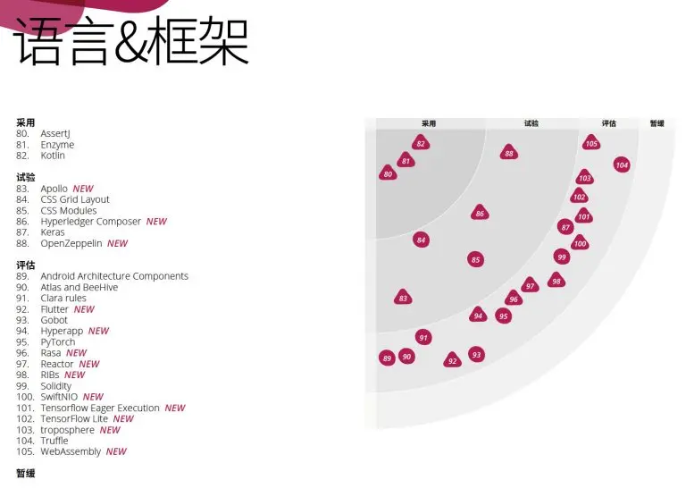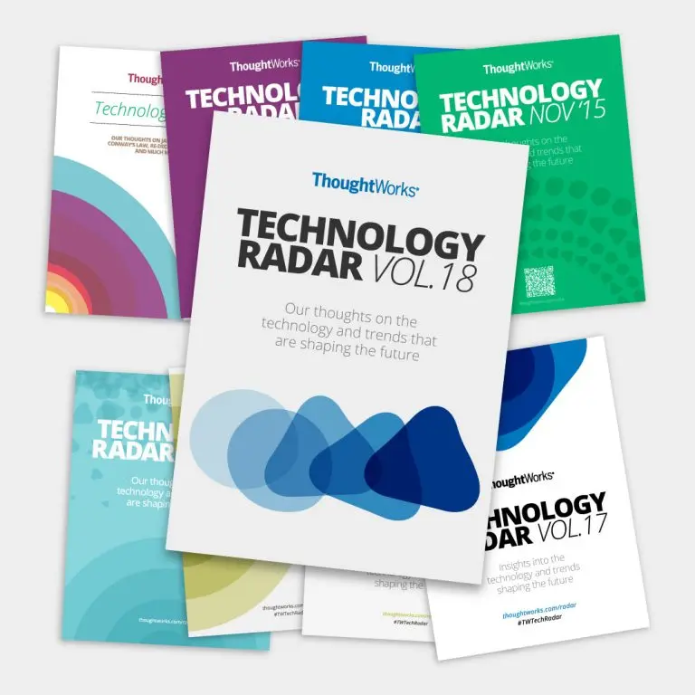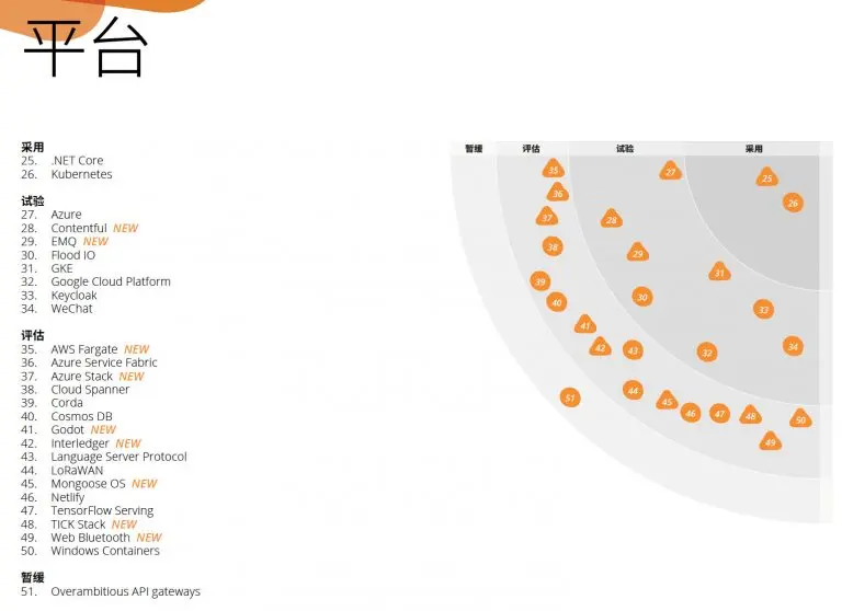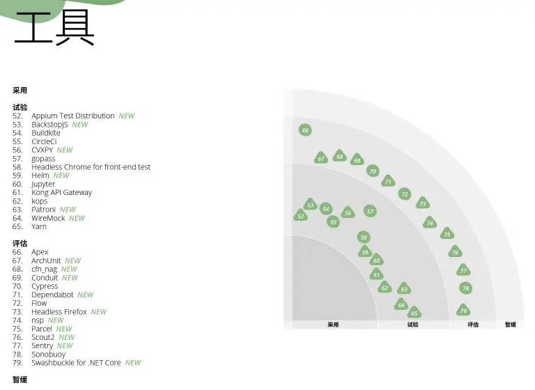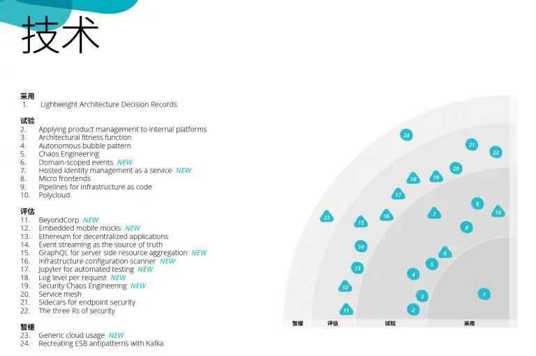 ThoughtWorks每年都会出品两期技术雷达,这是一份关于技术趋势的报告,由 ThoughtWorks 技术战略委员会(TAB)经由多番正式讨论给出,它以独特的雷达形式对各类最新技术的成熟度进行评估并给出建议,为从程序员到CTO的利益相关者提供参考。