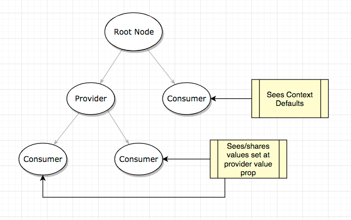 关于 Context 的更新引发了很多关注。实际上,在 16.x 的版本中 Context 的最终形态有点像状态管理系统本身。简而言之,context 设置了 provider 和 consumer。一个 provider 的所有子组件都可以访问其中应用的值。所有非子组件都会看到 context 的默认值。下图解释了这种关系。