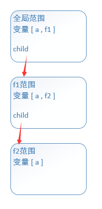 console.log(a)这个console.log(a)是在f2函数当中的,所以首先在f2函数的范围中寻找;如果f2中没有定义a,则去f1中去寻找,如果还没有定义a,则再往上一级范围去寻找 -