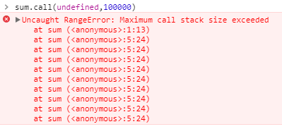 例如上面的递归代码,如果求sum,call(undefined,100000),由于递归的原因,栈内存从下到上会储存sum,call(undefined,100000)、sum,call(undefined,99999)、……、sum,call(undefined,1),但由于栈内存无法将这些全部放下,就会发生栈溢出