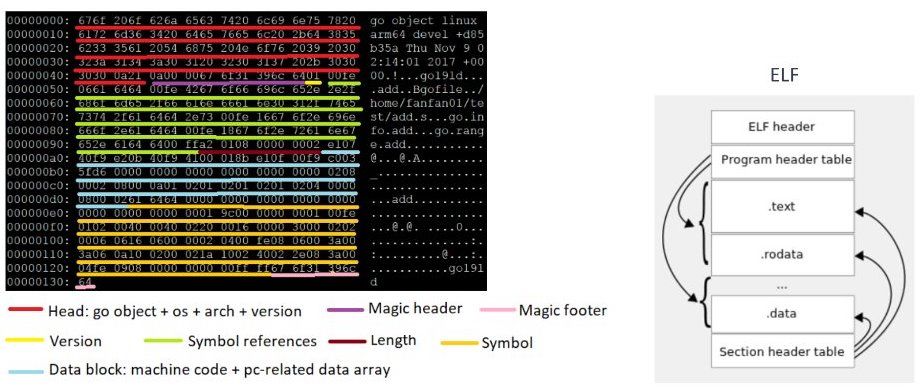 最后讲讲关于 Golang 的 Goobj 形式。大家都知道,Gcc 编译 C 文件也会生成 ELF obj 文件,他们的概念是一样的,但是千万不要用分析 ELF obj 文件格式的工具来分析 Goobj 文件。如上图所示,Goobj 和 ELF obj 的文件结构 一开始都差不多,但在最前面有一些 header,而右边是我们说的程序的表头,开始就不一样了。所以特别提醒大家对于 Golang 生成的 obj 文件要用自己的工具去分析。