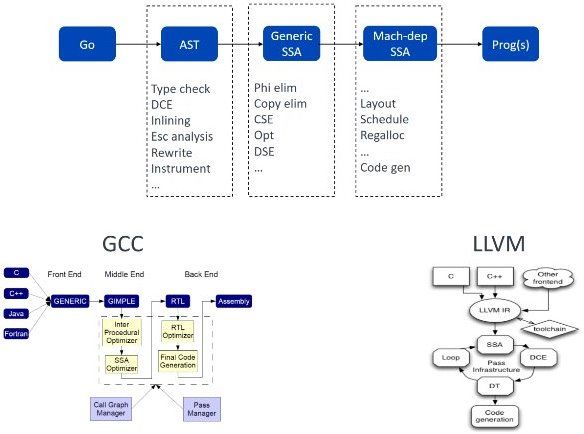 上面 Prog 这段代码是从 Golang 工具链 代码里面摘出来的,描述了一条具体的机器指令。我在这个“机器”上面加了引号,因为它是针对机器的汇编语言,离真正的机器指令还有一定的差距 。最后总结一下编译器的三个阶段,前端处理跟语言相关的信息,中端处理跟机器无关的优化,后端处理跟机器有关的指令选择和寄存器的分配。 顺便谈一下和 Gcc 编译器的一些不同点,它已经达到 2-300 个 pass ,而 Golang 编译器只有几十个 pass,所以 Golang 编译器相对于Gcc 编译器还是很弱的,其实这里有很多 的原因。一个原因就是谷歌可能更追求编译的速度,你做的事情越复杂,编译的速度越慢。还有二制代码 文件的大小,有的时候要用空间换时间,例如我可能为了在最终运行的时候快一点,要进行一些循环展开,就让你的循环体几倍的增长。相比较于 Gcc 编译器,Go 编译器到目前为止比较高级的编译优化都没有做。