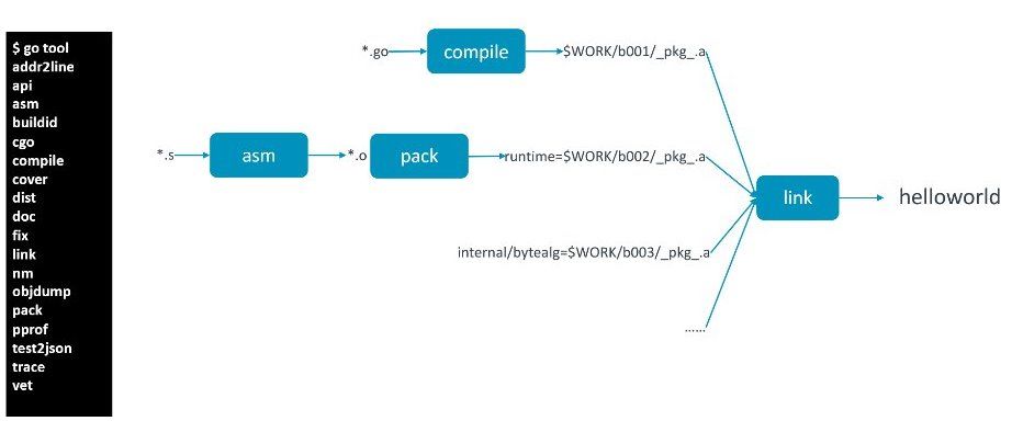 大家用的最多的可能是 Go build 或者是 Go install,这些工具会调用一些其他的工具,比如 compile 和 asm。asm 就是做一些机器码的生成,最后把各个包(package) 给 link 做一个拼装,生成最终可执行的代码。