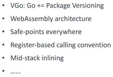 最后还有一些跟体系结构相关的优化,现在函数调用的时候 Go ABI 不管是什么机器都通过内存传参, 但 Arm 的寄存器非常多,这样可以考虑优化成寄存器传参,究竟要不要打开这样的优化有许多问题需要考虑,因为 一旦打开,首先你调试体验就会变得很差,参数和指针找出来也变得麻烦 ,这一问题已经讨论一年多了,但还没有结论。另外就是关于 inline,如果做得比较激进的话,性能会有比较大幅度的提升,但同样也会带来很多寄存器传参类似的问题。