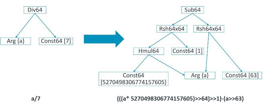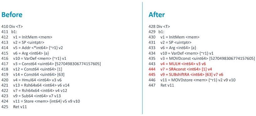 举一个更详细的例子,比如说在 Go 语言写了一个整数除以常数,但是最终生成的指令并没有真的做除法,而是 把除法变成了加减乘除的简单运算,如上图所示,保证左边和右边的结果一样。从 运行速度来看,不管是 X86 平台、Arm 平台或者其他的平台,都是右边 的更快。不管你最终目标机器是什么体系结构,中端都会对这个常数除法表达式执行这个优化 。