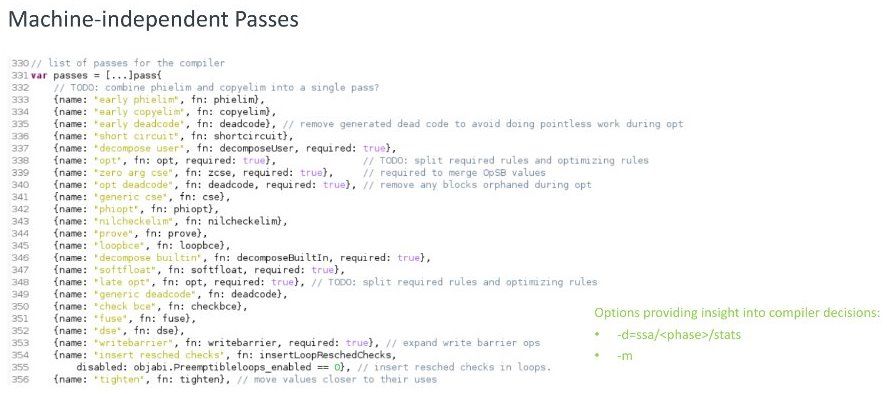 第二阶段中端跟 Go 语言关系不大,做的也是跟目标 机器无关的事情,最常做的就是一些简单的优化。上图是中端现在支持的 所有 pass。我们拿到一个函数,后要一个 pass,一个 pass 去做遍历,把没用的节点和结构 删掉,或者把有用的信息填进去。其实有一个 pass:opt 现在做得不是很好,不管你编译 Go程序 时,优化开关有没有打开,其实都会运行 opt pass。现在 Golang 的调试体验不佳,可能跟这个 pass 有点关系, 因为有一些编译优化是你无法彻底关掉的。谈到调试的话我注意到谷歌的工程师其实 在不断地改进用户体验,不管是我们这里说的中端部分还是最终的调试信息,他们一直都在改进 。