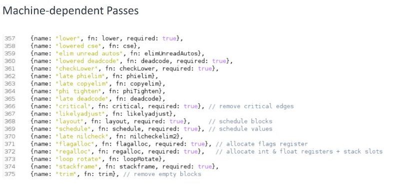 还有机器指令的选择。还是以前面的常数除法为例,上图左边是机器 无关的表示,右边是 Arm64 目标机器上的最终后端生成的结果,注意红色的那三条指令。虽然中端的输出是一样的,但是不同的目标 机器到后端这里得到的结果就会完全不一样。