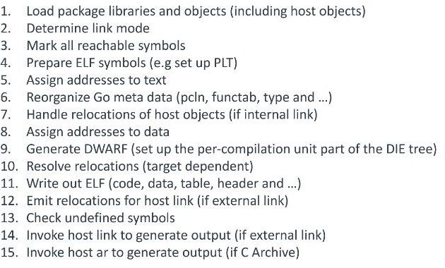 这个过程当中,我们连接器 link 干了很多事情,你连接的模式是内部连接的时候,也有可能是偷懒什么都不干,就调用了本地的连接器,这个过程和 Gcc的链接过程没有什么太大的区别,都是 生成可执行代码文件,link 就是干这个事情的。但是 Golang 的 link 比传统的 link 更加复杂,复杂的原因在 于 Go 可以和C 混在一块用,就意味着 Go 的 link 既要处理自己的编译器生成的文件,还要负责你本地安装的 C 语言工具链生成的文件,这种情况下文件格式就有很多了,C 语言工具链 生成的 pkg 都要由我们的 Go link 来处理,这个是蛮难的,而且这里面的一些标准一直都在变。比如说今天写的 link 明天还是不是符合这个标准 都很难说。因此 Golang 工具链偷懒了,就直接调用了外部的 link 做这个事情。