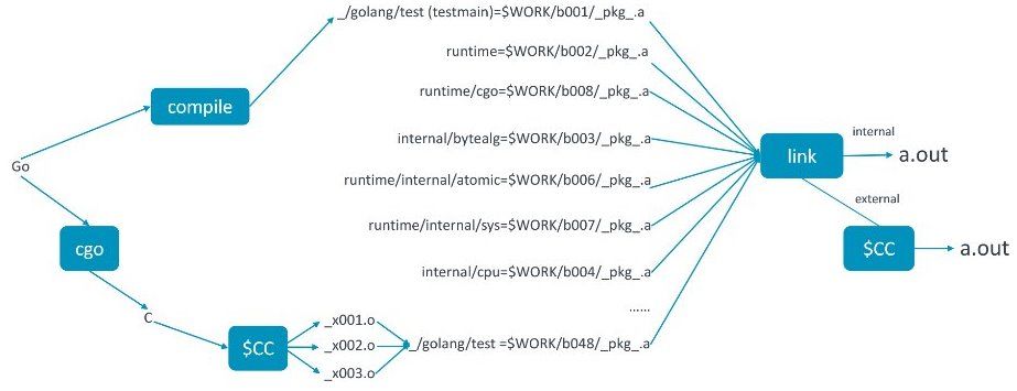 首先介绍一下基本概念,我们写了一个 Go 程序,有很多 Go 文件,可能会被编译器编成目标文件,然后打包成 pkg,因为 Golang 是包 管理模式,如果 Go程序调用 C 程序,工具链还会调用 cgo,生成额外的 C 文件,并被本地的编译器 处理,生成的目标文件也会被打包成一个 pkg 文件,最后这些包的文件都会给我们的链接器, 生成最终的可执行程序。