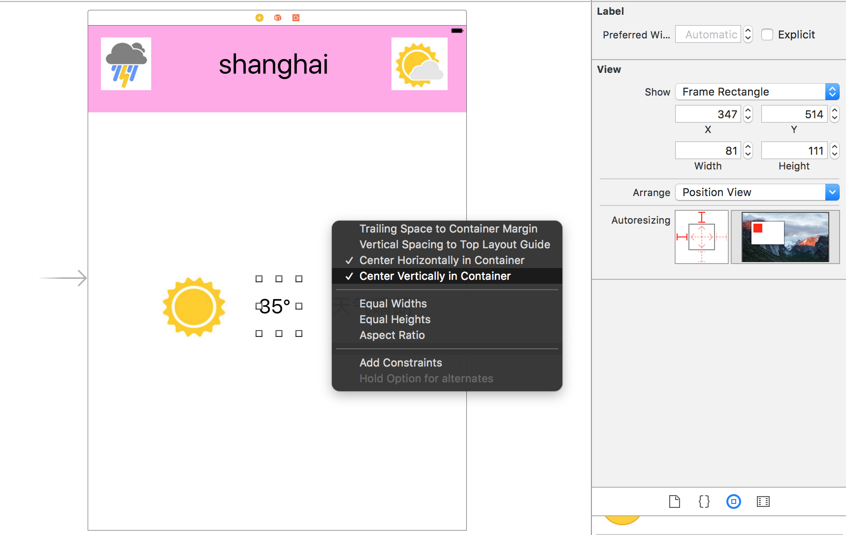 我们一次性选择“Center Horizontally in Container” 和 “Center Vertically in Container”。注意这个时候右边还是AutoresizingMask的面板,因为这个时候Label还没有任何的constraint。当我们点击“Add Constraints”的时候,就给Label加上了约束,右边的面板也变成了constraints面板了。