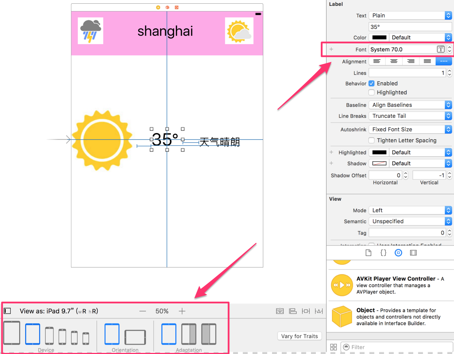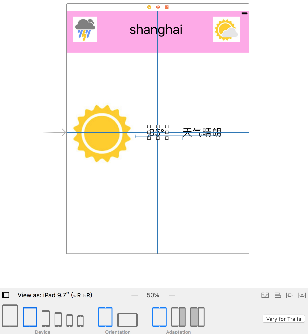 这个时候我们更新一下中间温度的Label的字体大小,这时候计算变大,由于我们的constraints都是正确的,两边的View也会随着Label字体变大而变大。