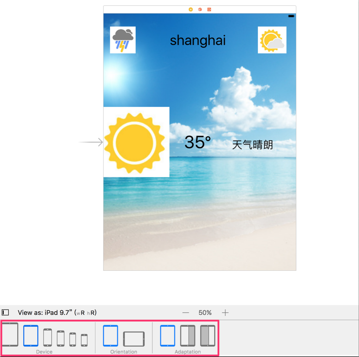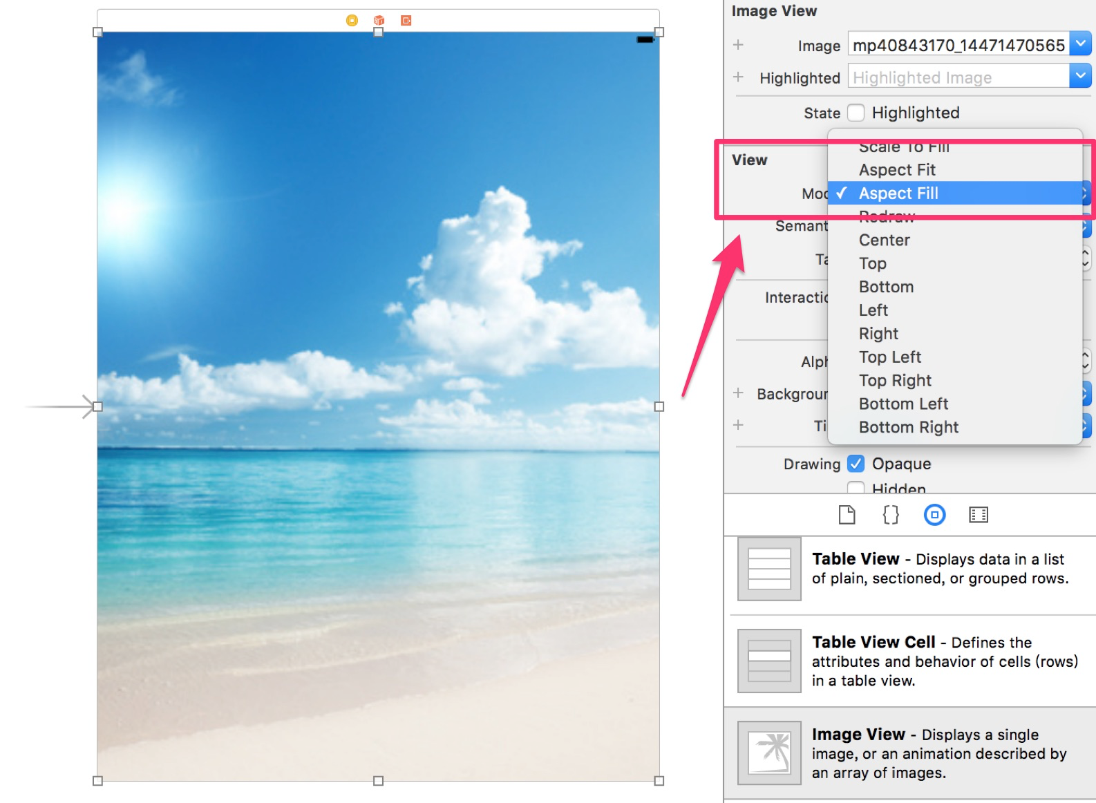 我们在继续给晴天的上海加上一个背景图。添加一个imageView,然后大小铺满整个父View,把mode 选择成“Aspect Fill”