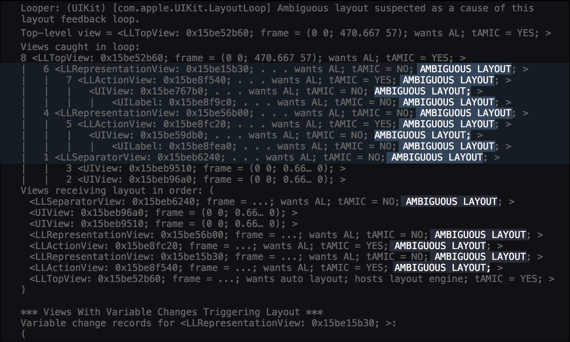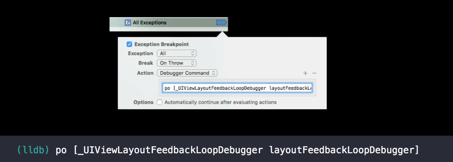 如果发现在一个Runloop中,layout在一个view上面调用的次数超过了阀值,这里设置的是100,也就是说次数超过100,这个死循环还会在跑一小段,因为这个时候要给debugger一个记录信息的时间。当记录完成之后,就会立即抛出异常。并且信息会显示在logs中。log会被记录在com.apple.UIKit:LayoutLoop(iOS)/com.apple.AppKit:LayoutLoop(macOS)中