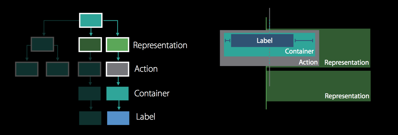 如图,label有leading和trailing padding,label是container的子view,container是action的子父,action是representation的子view。container和action view之间有一个居中的centering constraint。action view在representation view上有一个autoresizing mask constraints。
