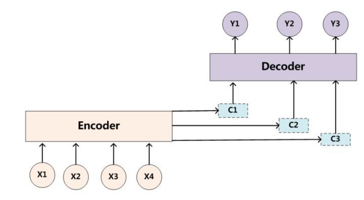 Decoder:是根据向量C(encoder的输出结果)和之前生成的历史信息y1,y2,...,yn来生成i时刻要生成的单词yi。