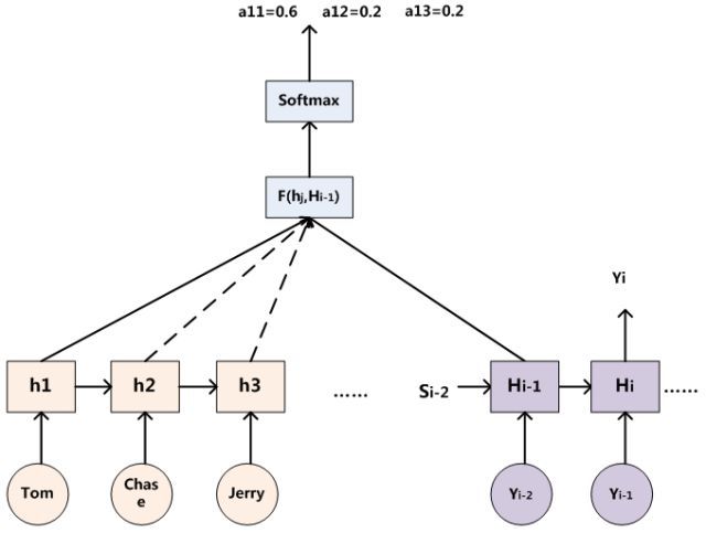 当前输出词Yi针对某一个输入词j的注意力权重由当前的隐层Hi,以及输入词j的隐层状态(hj)共同决定;然后再接一个sofrmax得到0-1的概率值。即通过函数F(hj,H i)来获得目标单词Yi和每个输入单词对应的对齐可能性。更多细节,请大家参看知乎何之源的文章,文末会给出文章链接。