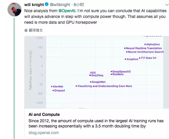 Will Knight:OpenAI 的分析非常棒,但我不认为 AI 的性能总是会随着计算能力的提高而进步。要是这样的话,多搞些数据和 GPU 就可以解决所有问题了。