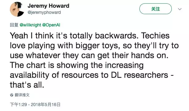 我认为这完全是在倒退。工程师们就喜欢玩这种游戏,所以他们会用所能拿到的所有资源来做这件事。这个图只能说明深度学习研究员能够得到的资源变多了——仅此而已。