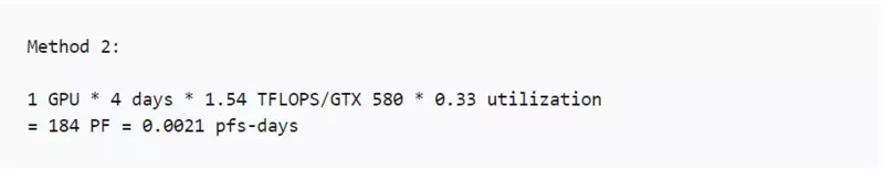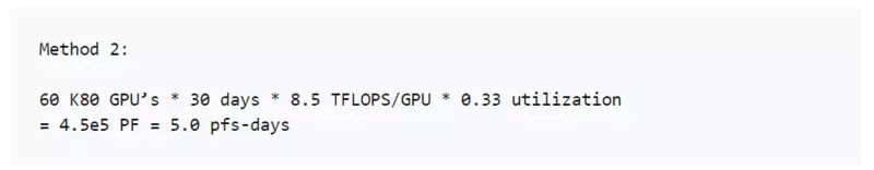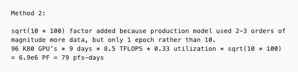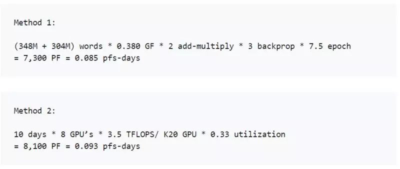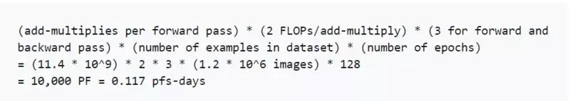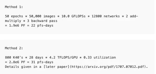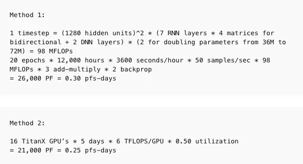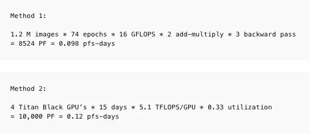 我们使用两种方法用于生成这些数据点。当我们有足够的信息时,直接在每个训练样例中描述的架构中计算 FLOP 的数量(相加和相乘),并乘以训练期间的前向和后向通道总数。当我们没有足够的信息来直接计算 FLOP 时,我们查看 GPU 的训练时间和使用的 GPU 总数,并设定使用效率(通常为 0.33)。在大多数论文中,我们能够使用第一种方法,但少数论文中我们使用第二种方法,并且尽可能对两者进行一致性检查。计算并不是精确的,我们的目标是把精确度保持在 2-3 倍的范围内。以下是一些示例计算。