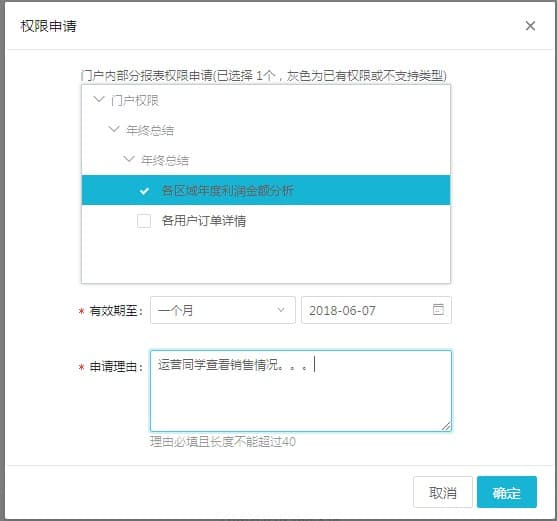 要求对运营同学开放 区域利润金额分析报表权限,对财务同学开通 用户订单详情查看权限。