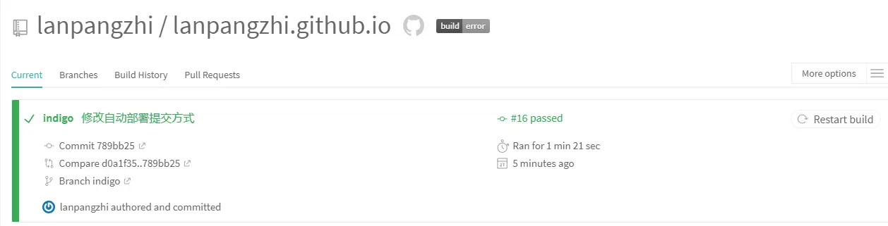 然后提交github,travis-ci就会自动构建了。 现在写博客只需要两步操作,第一步 hexo new "新的文章",第二步提交到github。travis-ci会帮你自动部署的。 省去了 hexo clean hexo g -d 的环节。