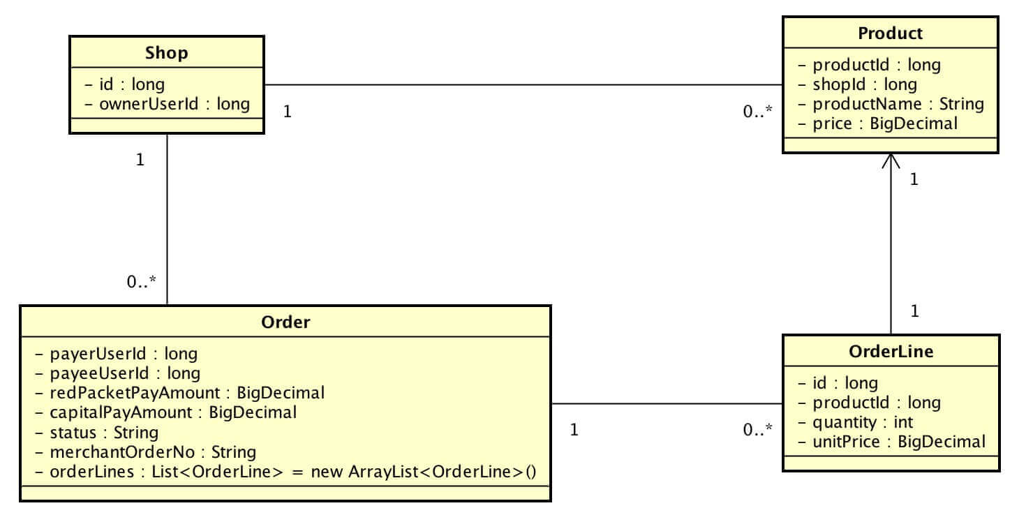 public class Order implements Serializable { private static final long serialVersionUID = -5908730245224893590L; /** * 订单编号 */ private long id; /** * 支付( 下单 )用户编号 */ private long payerUserId; /** * 收款( 商店拥有者 )用户编号 */ private long payeeUserId; /** * 红包支付金额 */ private BigDecimal redPacketPayAmount; /** * 账户余额支付金额 */ private BigDecimal capitalPayAmount; /** * 订单状态 * - DRAFT :草稿 * - PAYING :支付中 * - CONFIRMED :支付成功 * - PAY_FAILED :支付失败 */ private String status = "DRAFT"; /** * 商户订单号,使用 UUID 生成 */ private String merchantOrderNo; /** * 订单明细数组 * 非存储字段 */ private List<OrderLine> orderLines = new ArrayList<OrderLine>(); }