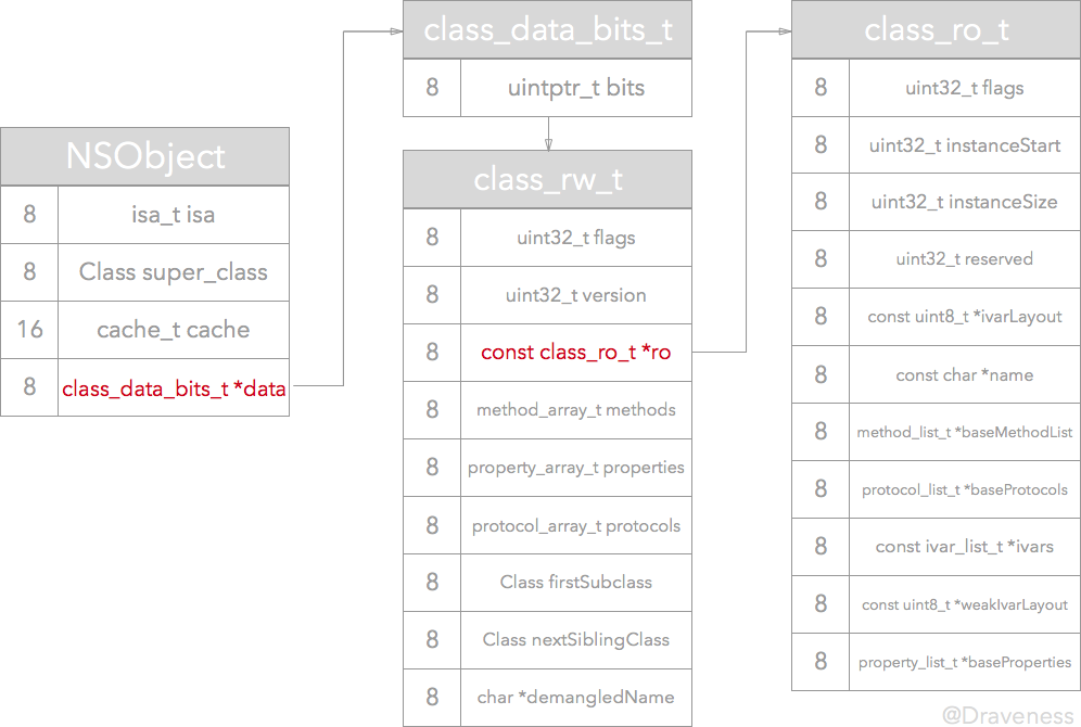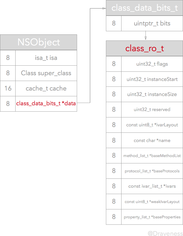 下面我们说下class_rw_t和class_ro_t的关系,然后再来验证。在编译期间,类结构中的class_data_bits_t *data指向的是class_ro_t *指针,用类图来表示一下: