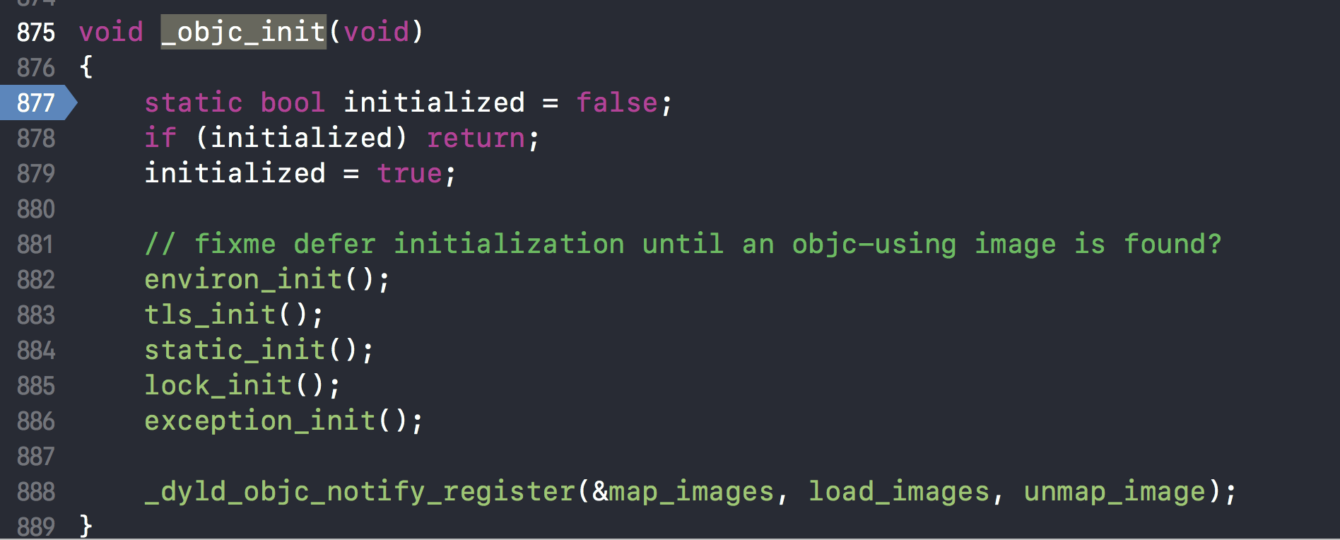 接下来在_objc_init方法打一个断点,这个方法是运行时初始化之前调用的。