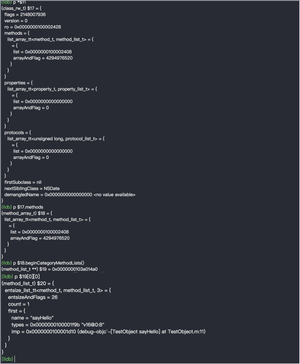 imp = 0x0000000100001d10 (debug-objc`-[TestObject sayHello] at TestObject.m:11)
