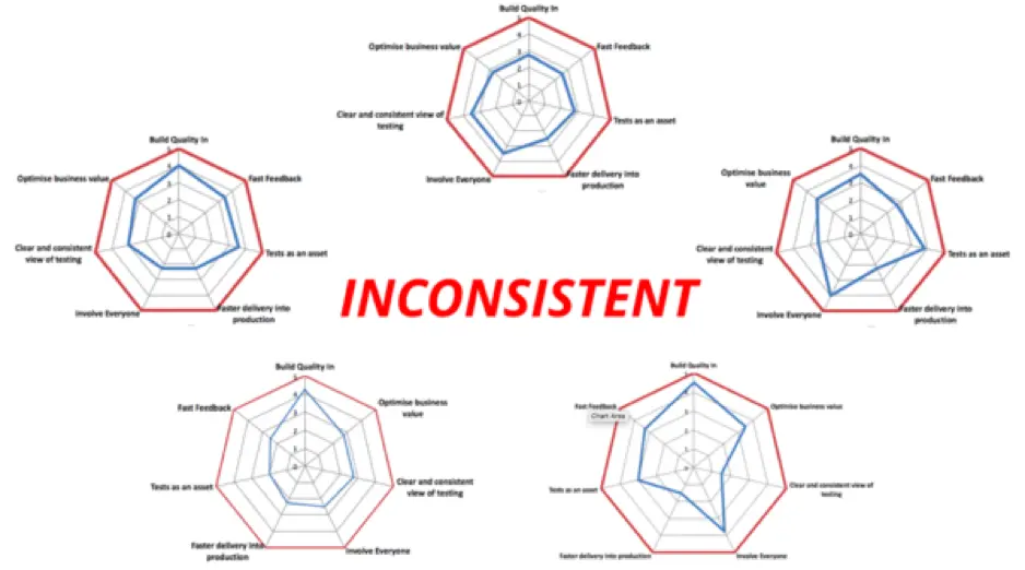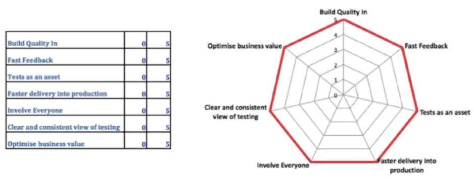 第三步:根据更新过后的模型指标对项目上的一个team做评估试点,详细分析该team对应到测试原则各个维度的well和less well部分,由评估小组成员一起打分,得到该team的评估结果图。
