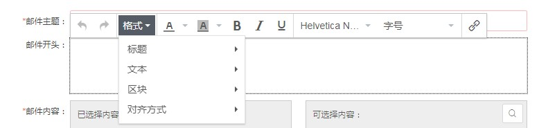 2.邮件开头,可以设置标题、文本、区块以及对齐方式等格式,还可以设置字体颜色、字号以及背景色、超链接等。