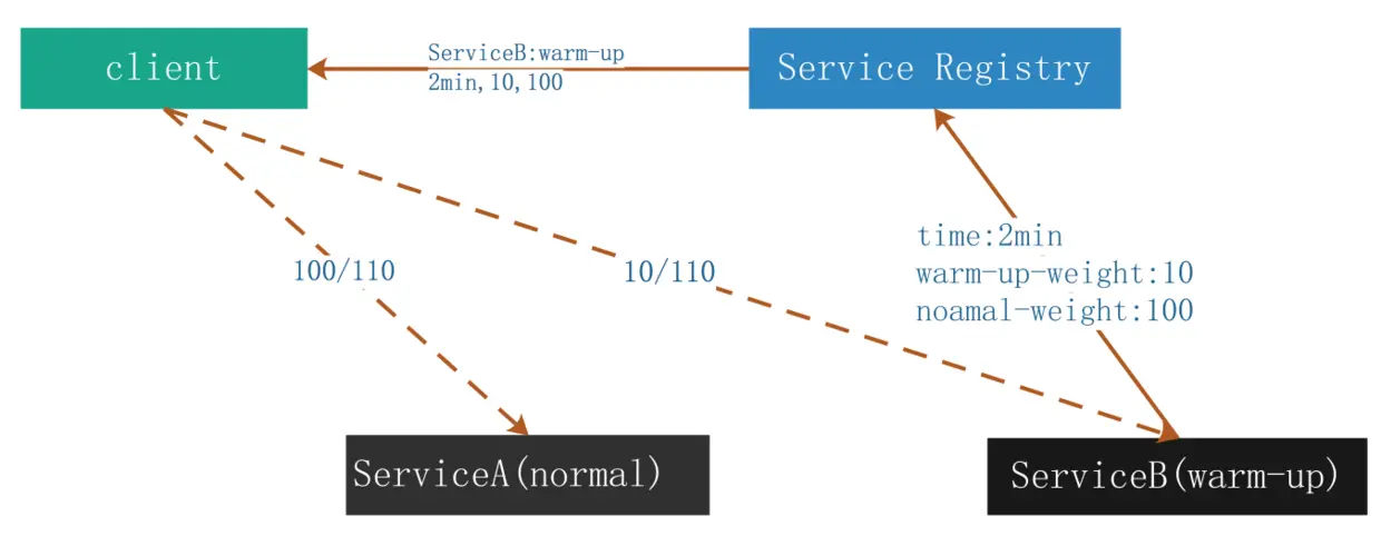 1.服务端服务在启动时会将自身的预热时间,预热期内权重,预热完成后的正常权重推送给服务注册中心。如上图 ServiceB 指向 Service Registry 。