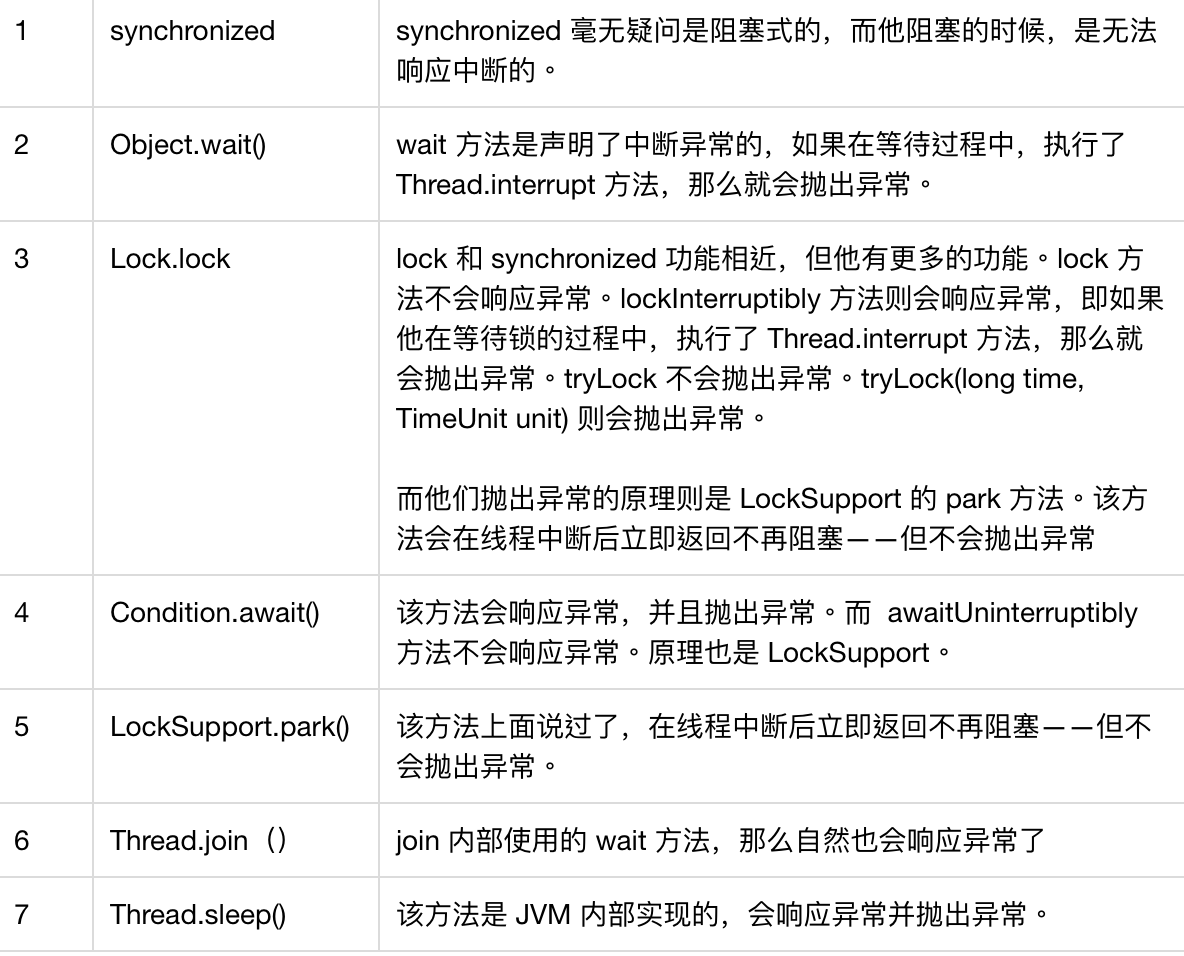 - Java 中同步和锁相关的 API 哪些可响应中断,哪些不可响应中断。总结下来就是 Lock 更灵活的对待中断。